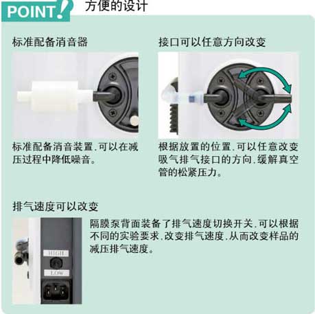PRODUCTFEATUTES产品特色1.易于与旋转蒸发仪集成,整个系统是为同一品牌装置设计的;2.1000型可达到30l/mi1000pa标准型,2000型可达到44l/min,1000pa大排量型,适用于大型装置的减压,2100型可达到30l/min200pa高真空型,适用于高沸点样品的浓缩;3.节约实验室空间,运输和使用内置扳手移动;4,操作简便便利,更换油泵的油水无问题。5.排气速度选项开关设计根据用处不同,高用以高速排气,low静音减低当按下时使用;6.气振阀是标准化配置。开启气振阀时,可以通过隔膜泵排出引入气振阀的有机溶剂,可以有效性保障隔膜泵并缩减膜的损失,但是气振阀opening会影响真空度;7.NVP系列隔膜泵可以与溶剂回收装置一齐使用,并且可以在排气过程中回收溶剂;8.v型为变频型真空泵,并且噪声较低。真空控制器NVC-3000可以直接连结和使用,真空度可以比平常种类快。SYSTEM系统配置